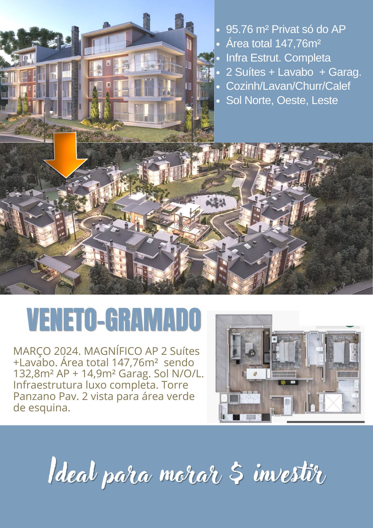 Este incrível apartamento de alto padrão localizado no bairro Carniel em Gramado-RS é o cenário perfeito para quem busca conforto, luxo e sofisticação. Com 2 dormitórios, sendo 2 suítes, e 2 banheiros, possui uma área privativa de 95.65m², garantindo espaços amplos e bem distribuídos. Uma ampla sacada e posição solar excelente Norte, Leste e Oeste